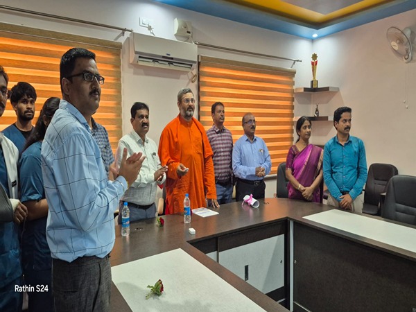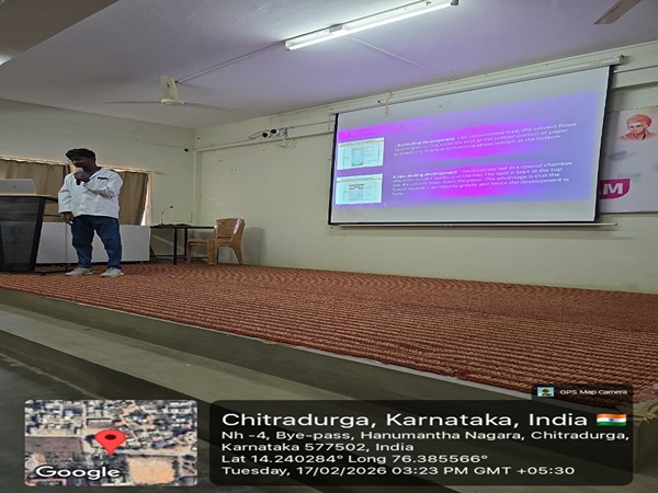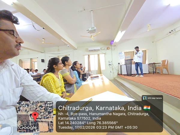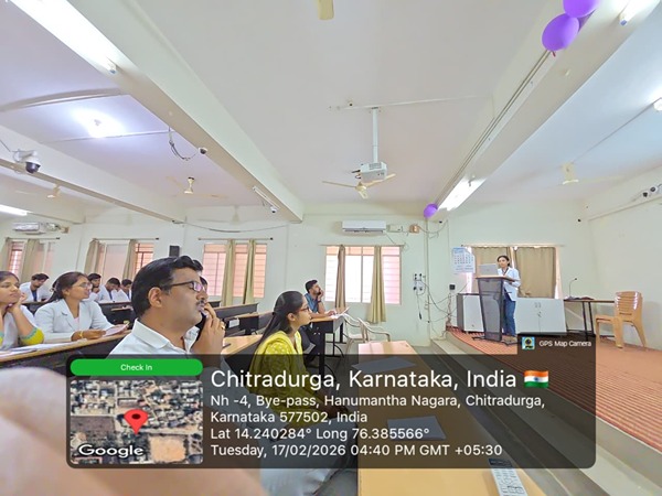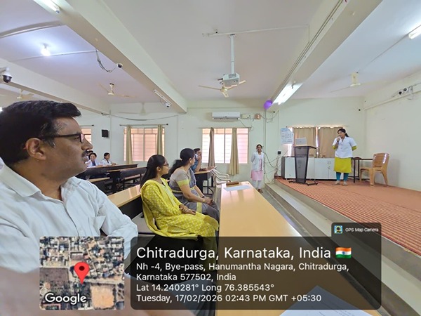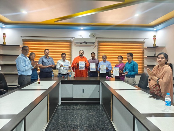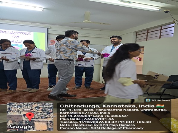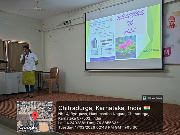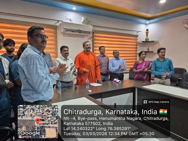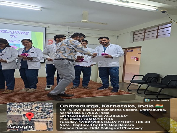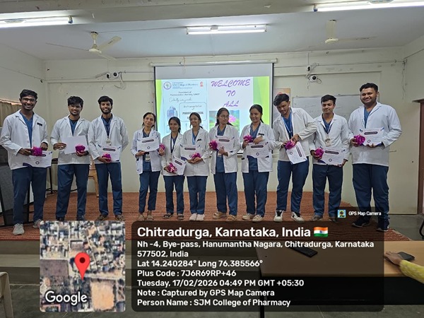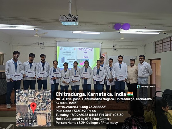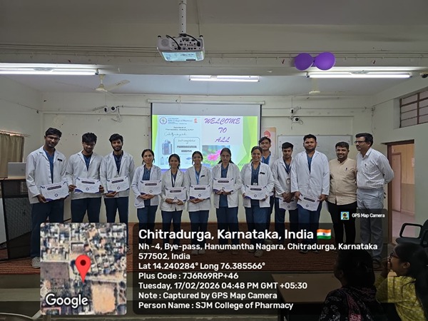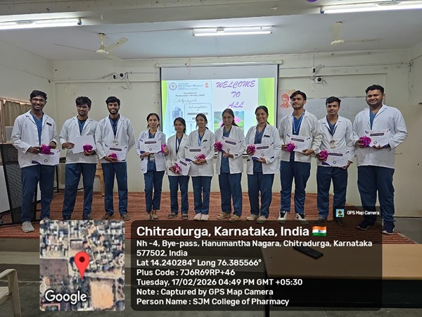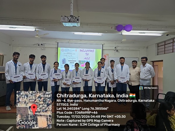 Shri Basavakumar Swamiji released information brochure of iCLAP- 2026 two day international conference at SJM College of Pharmacy. The conference will be held on 27-28 March 2026 under the theme Innovation in Pharmaceutical practice. Then Basavakumar Swamiji spoke that modern world new invention creates new problem with it. As a solution to this, study and research are important. There is no limit to pharmacy research and study.